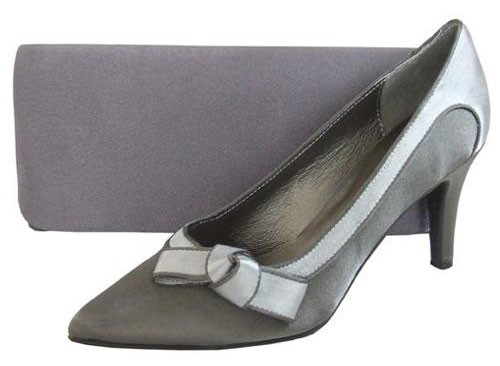 Elegant satin clutch bag by Menbur Spain. Small self-coloured rope handle enclosed & magnetic catch fastening. Width 23cm height 10cm. Perfect match for the Menbur grey shoes